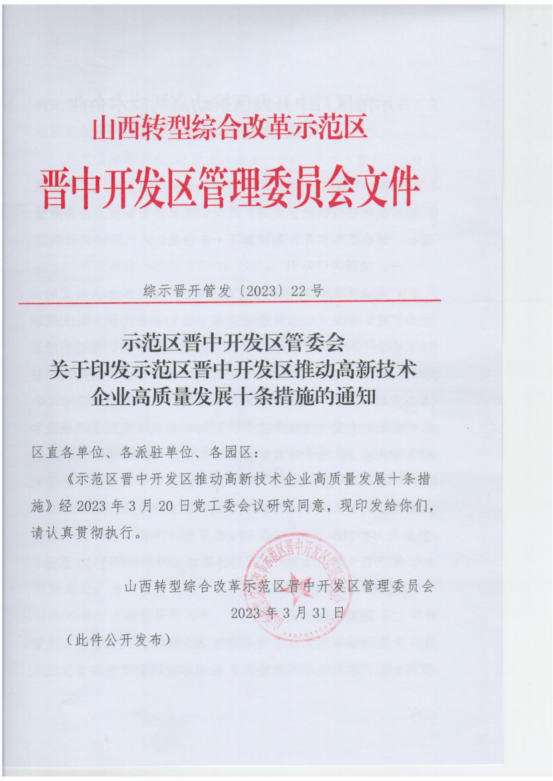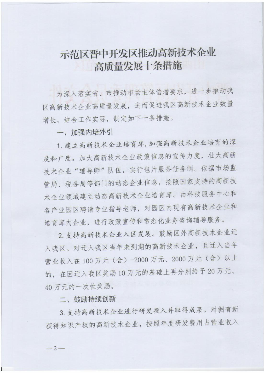 關于印發(fā)示范區(qū)晉中開發(fā)區(qū)推動高新技術企業(yè)高質量發(fā)展十條措施的通知